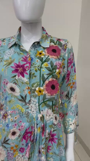 Step into effortless elegance with this Sky Print Muslin Indo-Western Drape Dress from Label Anju Kumar. Crafted from soft and flowy muslin fabric, this one-piece semi-formal drape dress features delicate embroidery on the neckline, blending ethnic grace with contemporary flair. Perfect for festive gatherings, brunches, or evening celebrations, it’s a stunning choice for those who love fusion fashion.