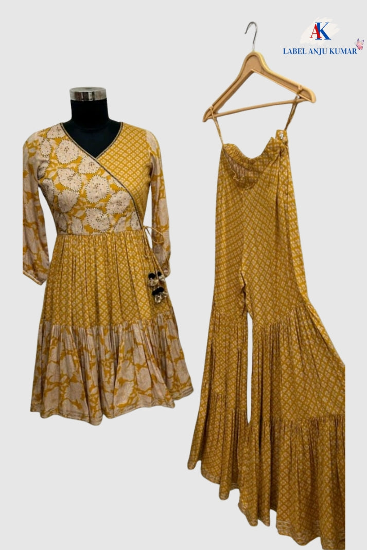 Bring timeless charm to your wardrobe with this Mustard Muslin Angrakha Style Sharara Set from Label Anju Kumar. Crafted from soft, flowy muslin fabric, this semi-formal ensemble features a graceful angrakha-style kurta paired with a coordinated sharara and dupatta, creating a perfect balance of tradition and elegance. Ideal for festive occasions, family gatherings, and cultural events.