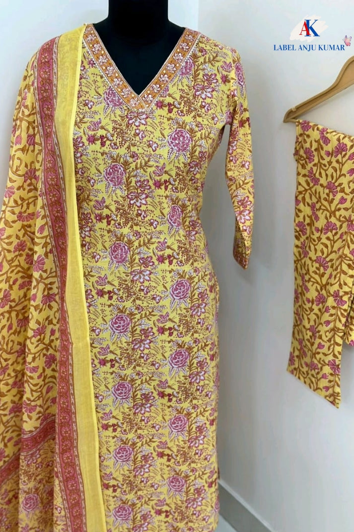 Lemon Cotton Straight Suit & Dupatta Set with V-Neckline | Label Anju Kumar