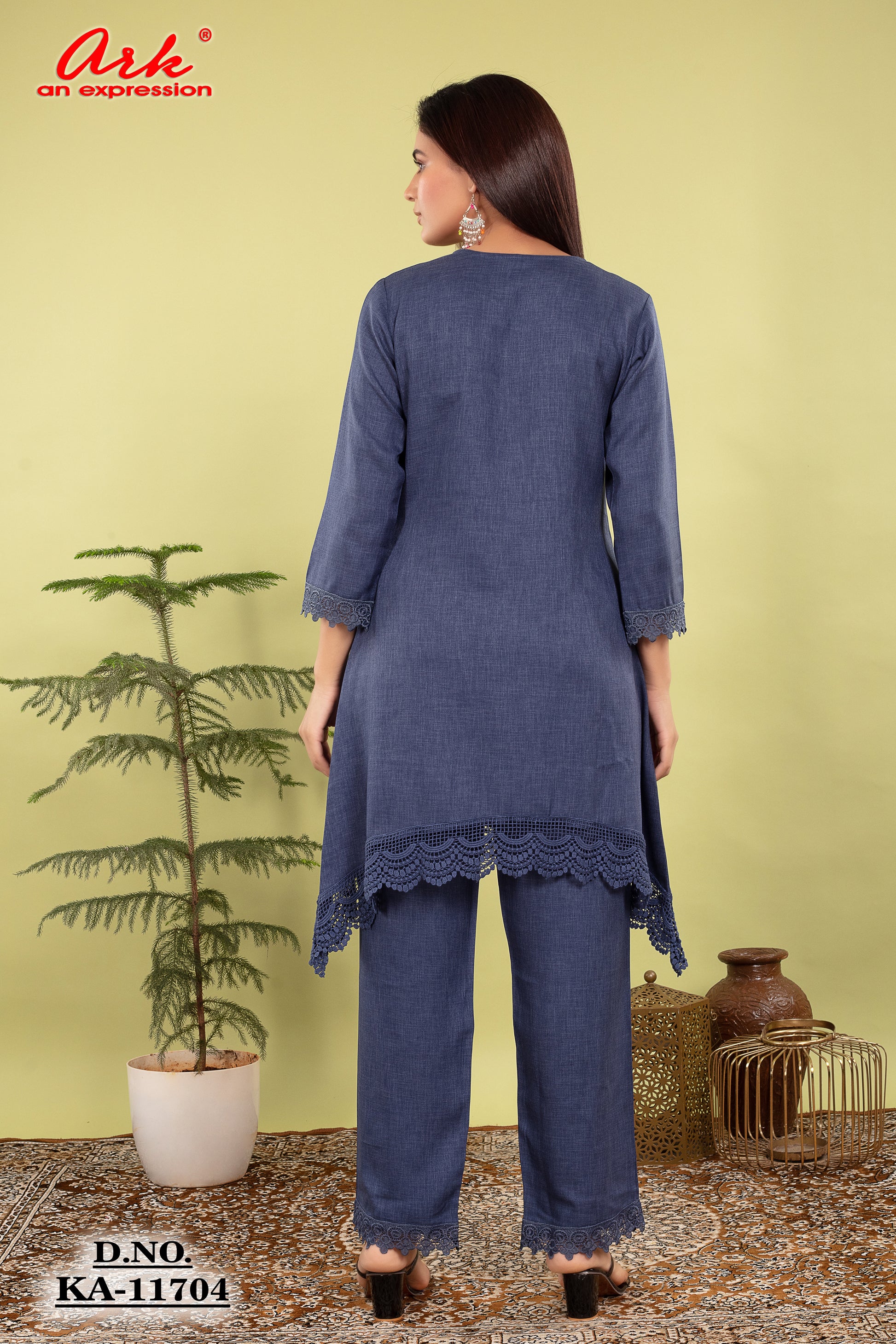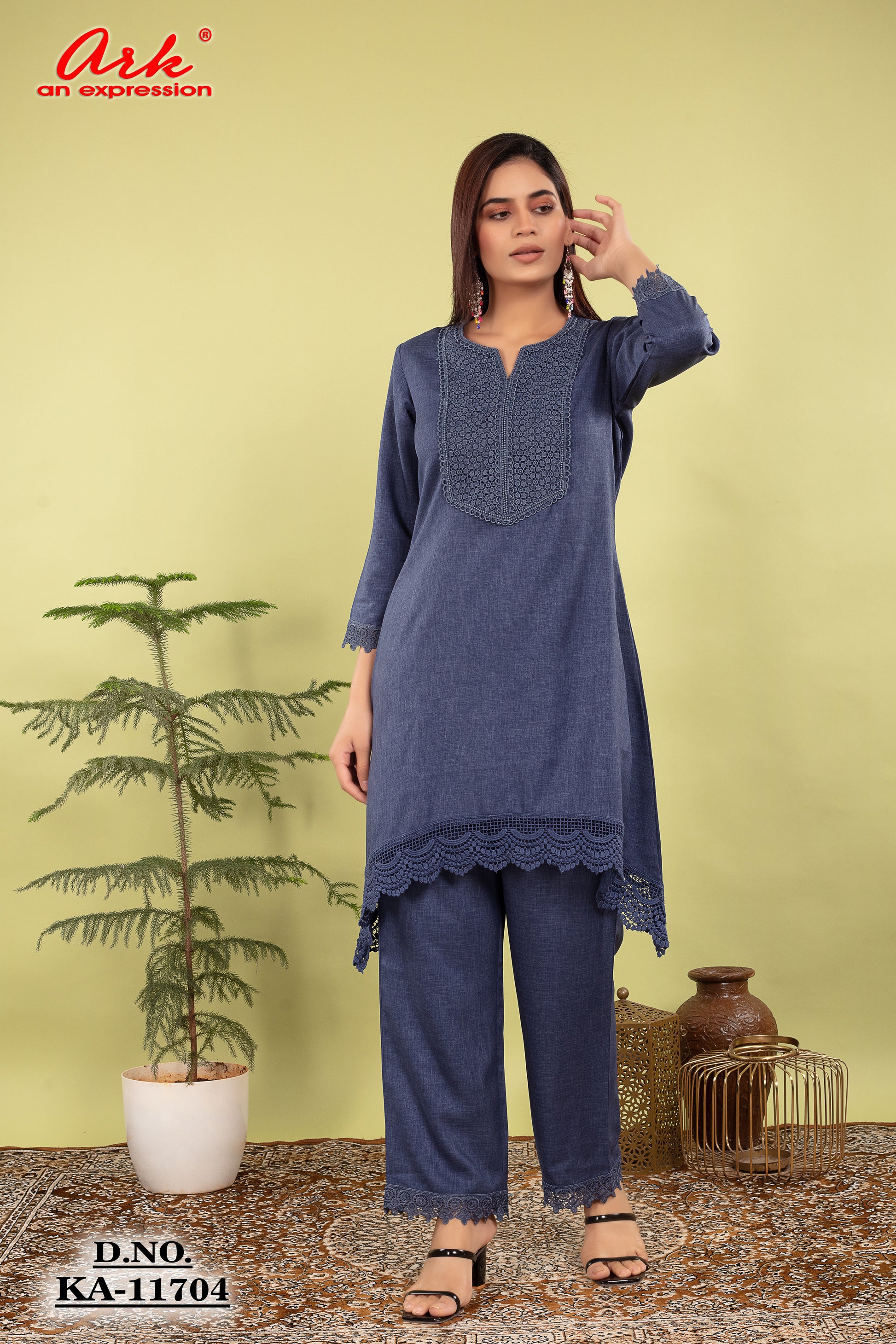 This denim blue cotton lilen coord set offers an effortless mix of style and comfort. The soft fabric, delicate lace accents, and elegant silhouette make it ideal for everyday elegance, festive brunches, and casual outings.