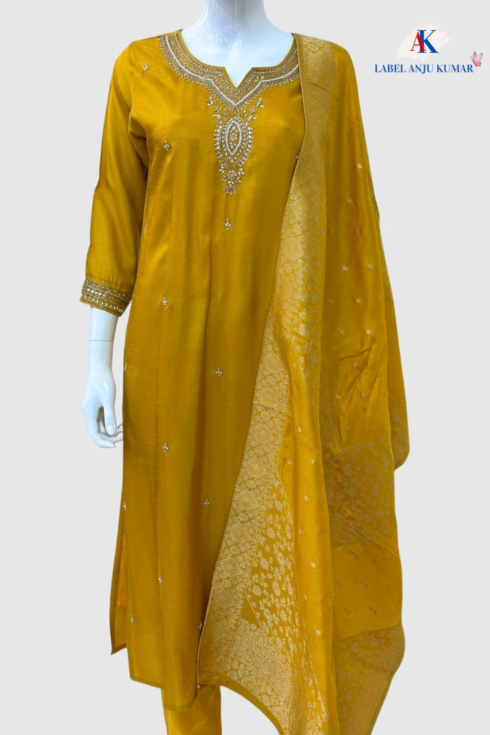 Yellow Silk Straight Suit Dupatta Set with Banarasi Dupatta & Hand Embroidery | Label Anju Kumar