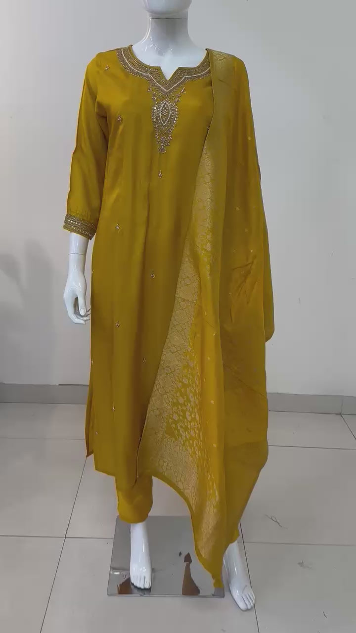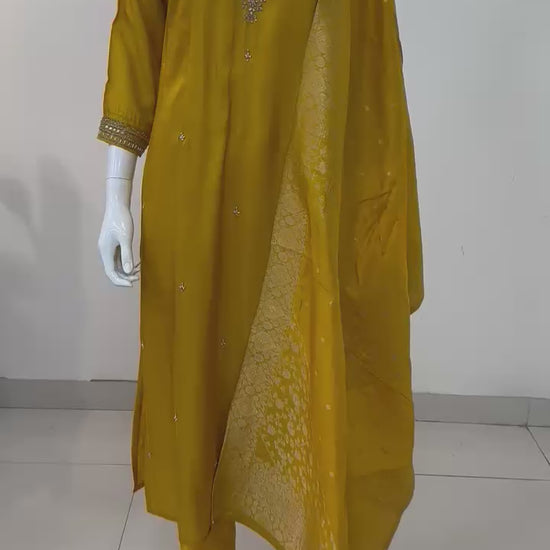 This yellow silk straight suit exudes sunshine and charm. Ideal for daytime festivities, weddings & cultural events, the Banarasi dupatta and elegant embroidery add regal flair.