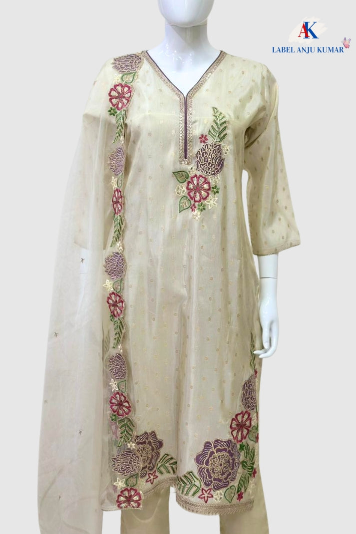 Off White Organza Straight Suit Dupatta Set with Heavy Embroidery | Label Anju Kumar