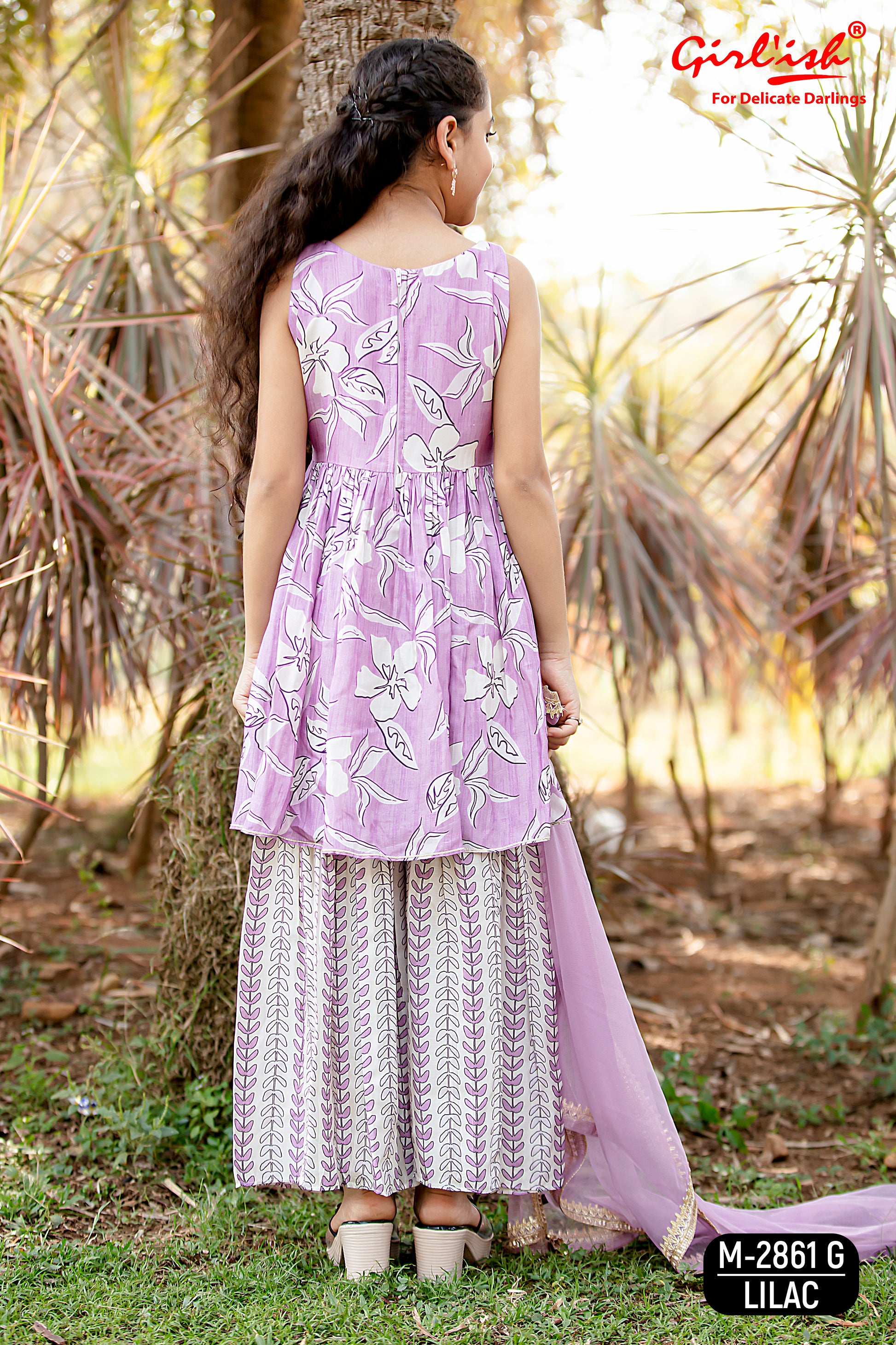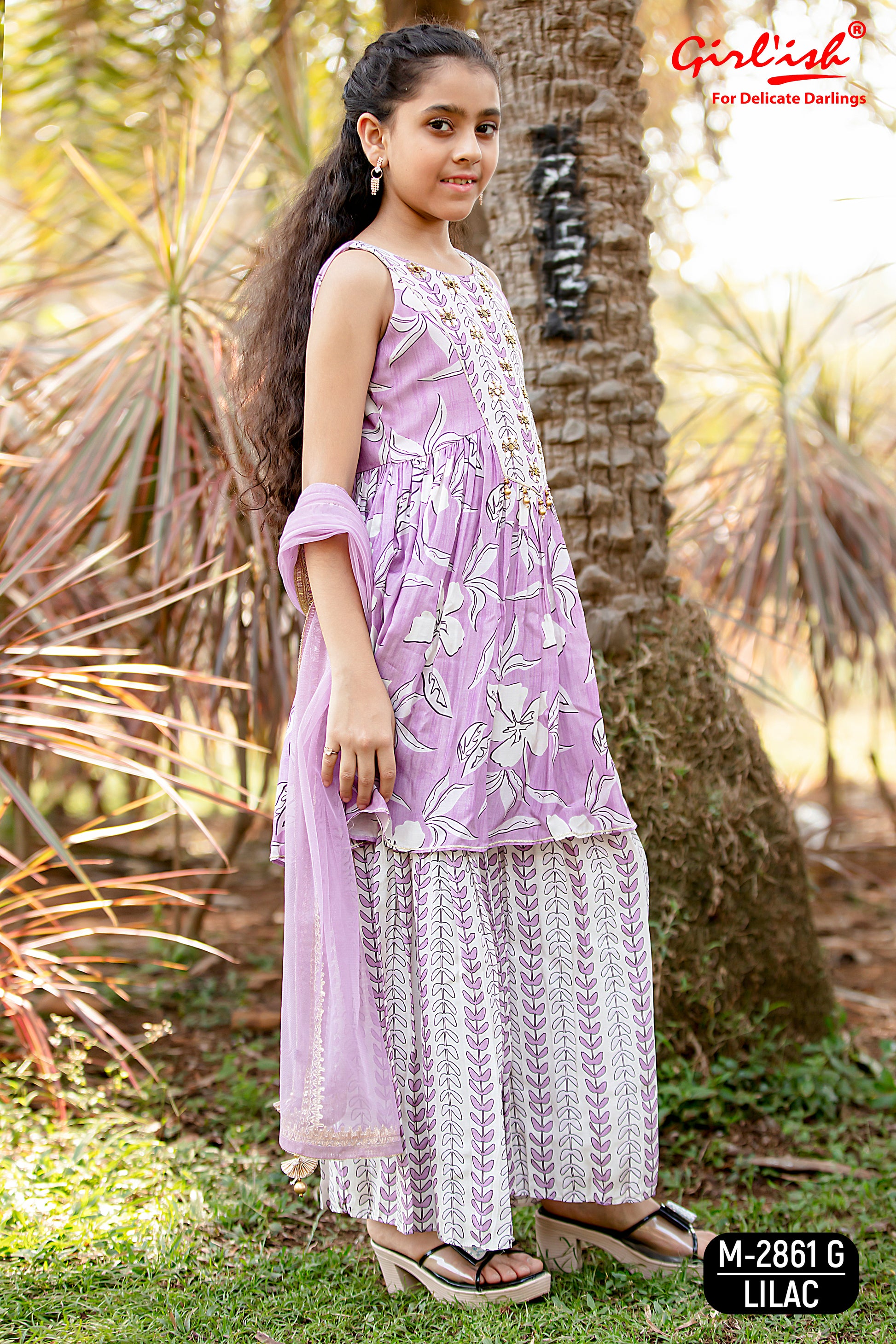 Kids Lilac Muslin Sharara Set with Handwork & Dupatta – Label Anju Kumar