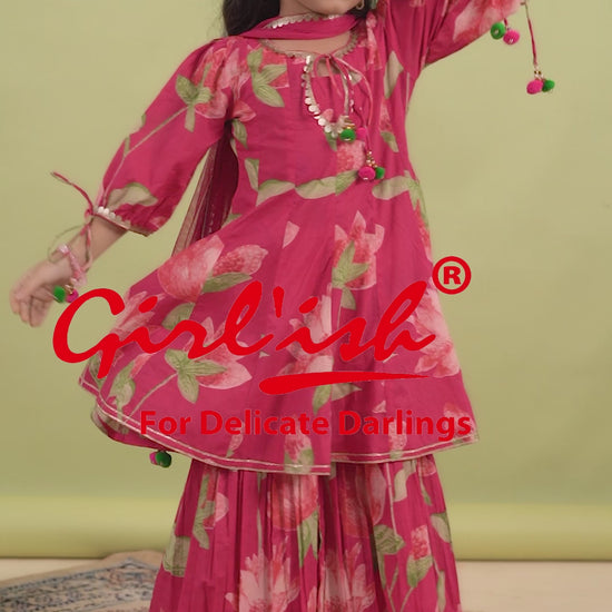 Majenta Pure Cotton Kids Anarkali + Sharara Set with Net Dupatta | Label Anju Kumar Kids