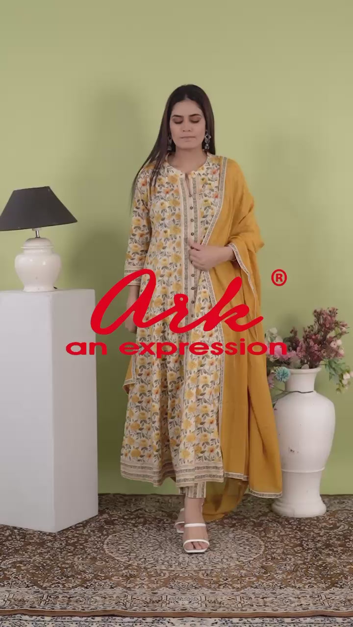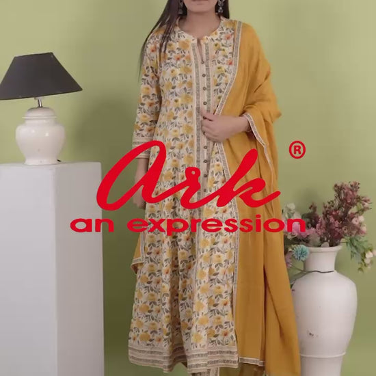Yellow Mustard Printed Pure Cotton Anarkali Suit Dupatta Set | Label Anju Kumar